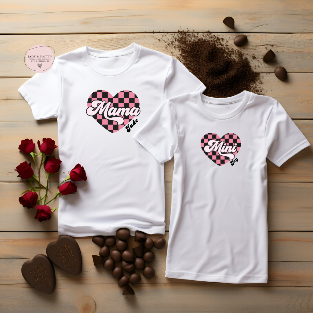 Mama & mini chequered heart Matching T-shirts | White PERSONALISED
